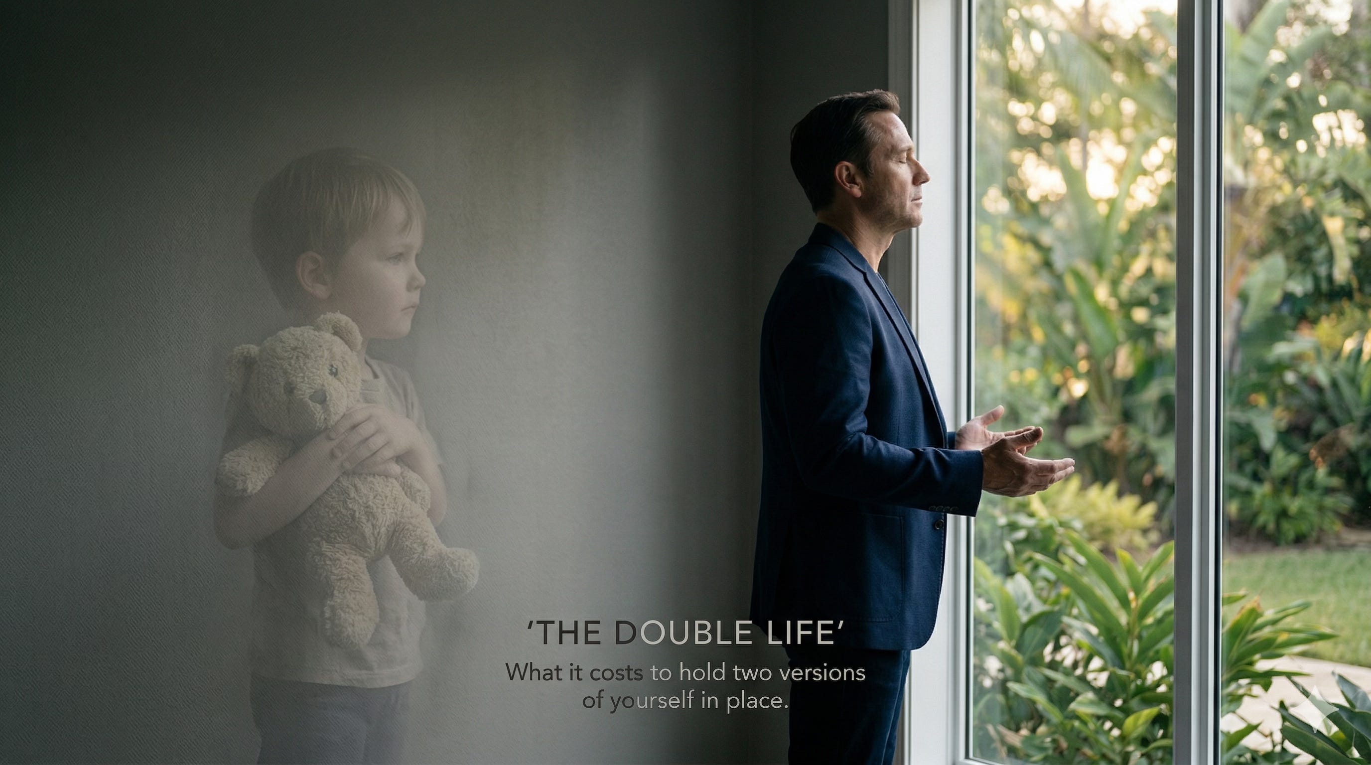 The double life is not dishonesty. Not exactly. It starts as competence. You learn early what the world rewards — composure, productivity, strength — and you get good at delivering it. You learn which emotions are acceptable and which ones need to be stored somewhere nobody can see. For a while, this works. The career advances. The surface holds. And somewhere underneath, a five-year-old is still driving the bus.